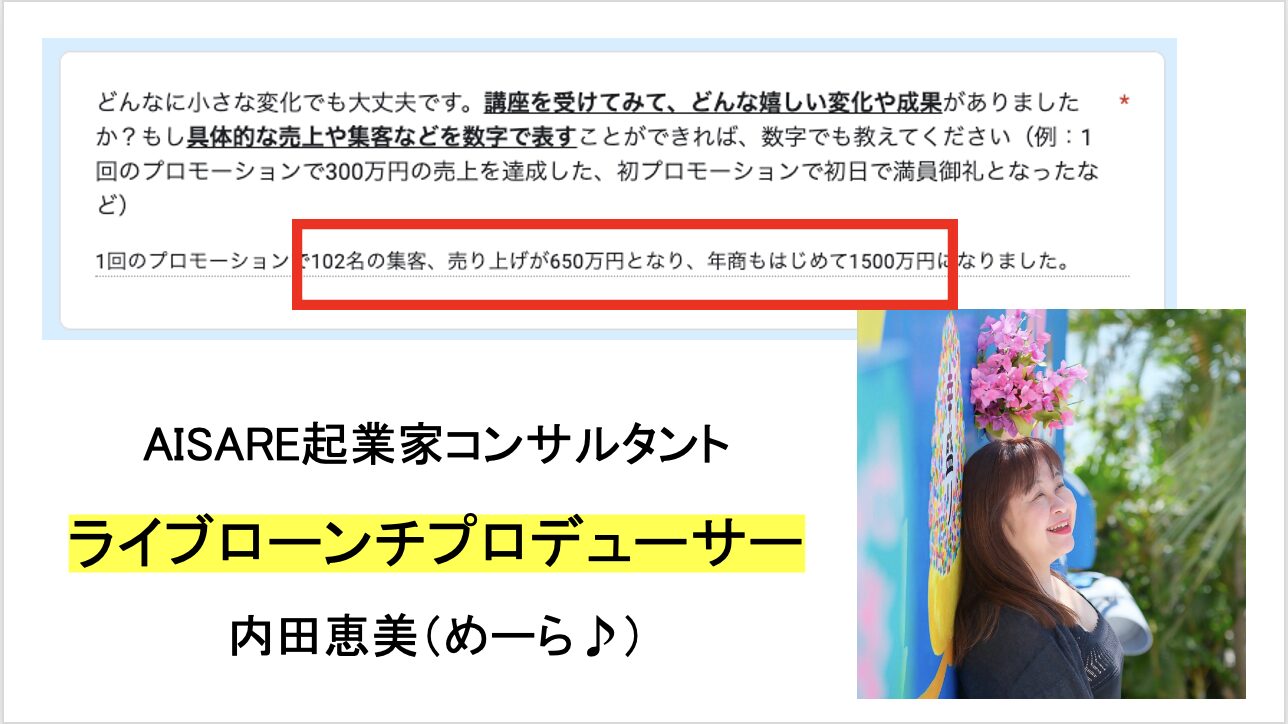 起業して、取調べスキルや起業塾で学んだノウハウを実行したところ、ありがたいことに初月に公務員時代と同じ収入のコーチング契約をいただき、Web集客のみで50人以上の方から体験セッション等のお申し込みをいただいています。起業6ヶ月目で売上7桁を超えることができました。